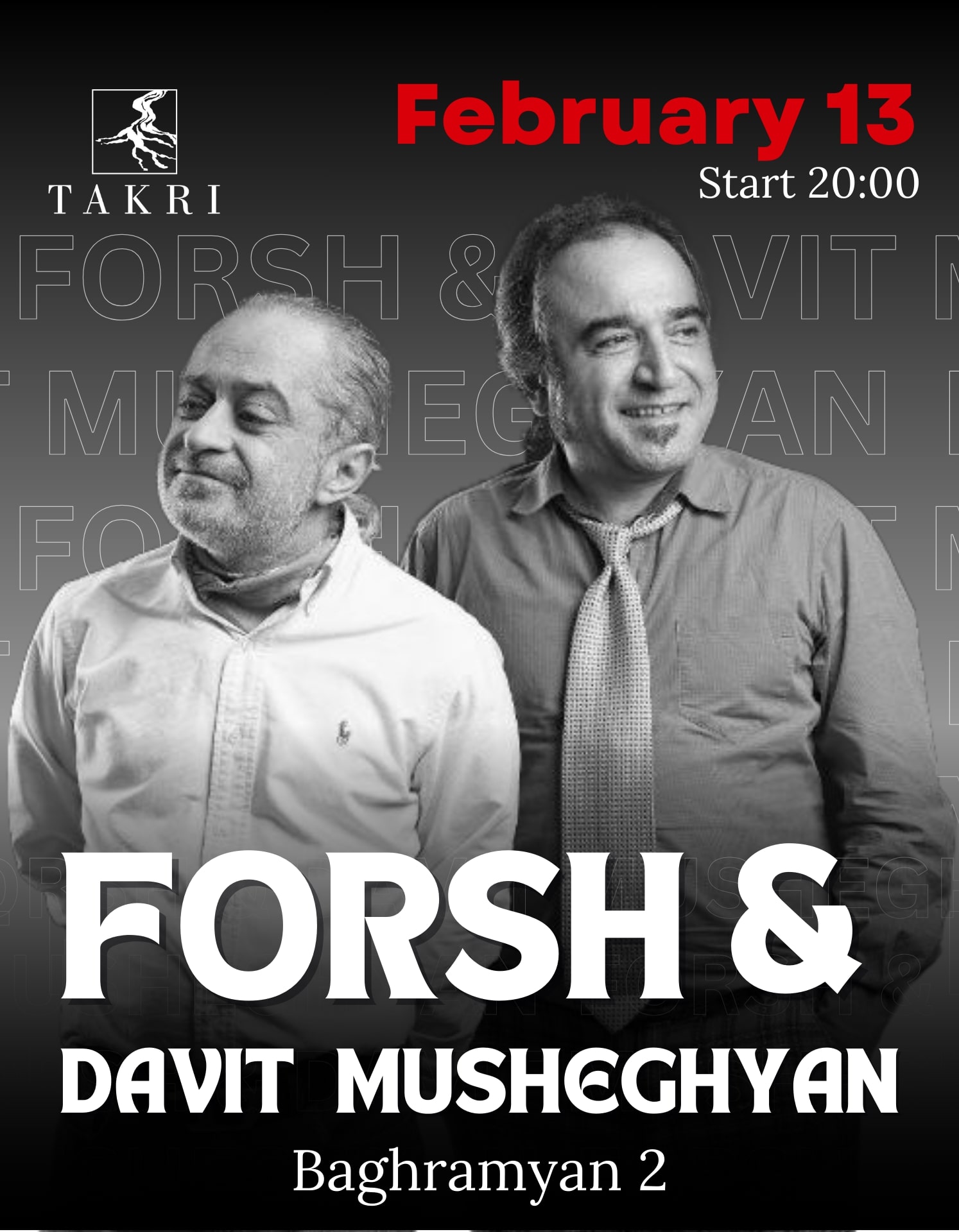 Փետրվարի 13ի երեկոն, ջերմ միջավայրում, իրենց անզուգական և սիրված ծրագրով, է՜լ ավելի կջերմացնեն Ֆորշն ու Դավիթ Մուշեղյանը: