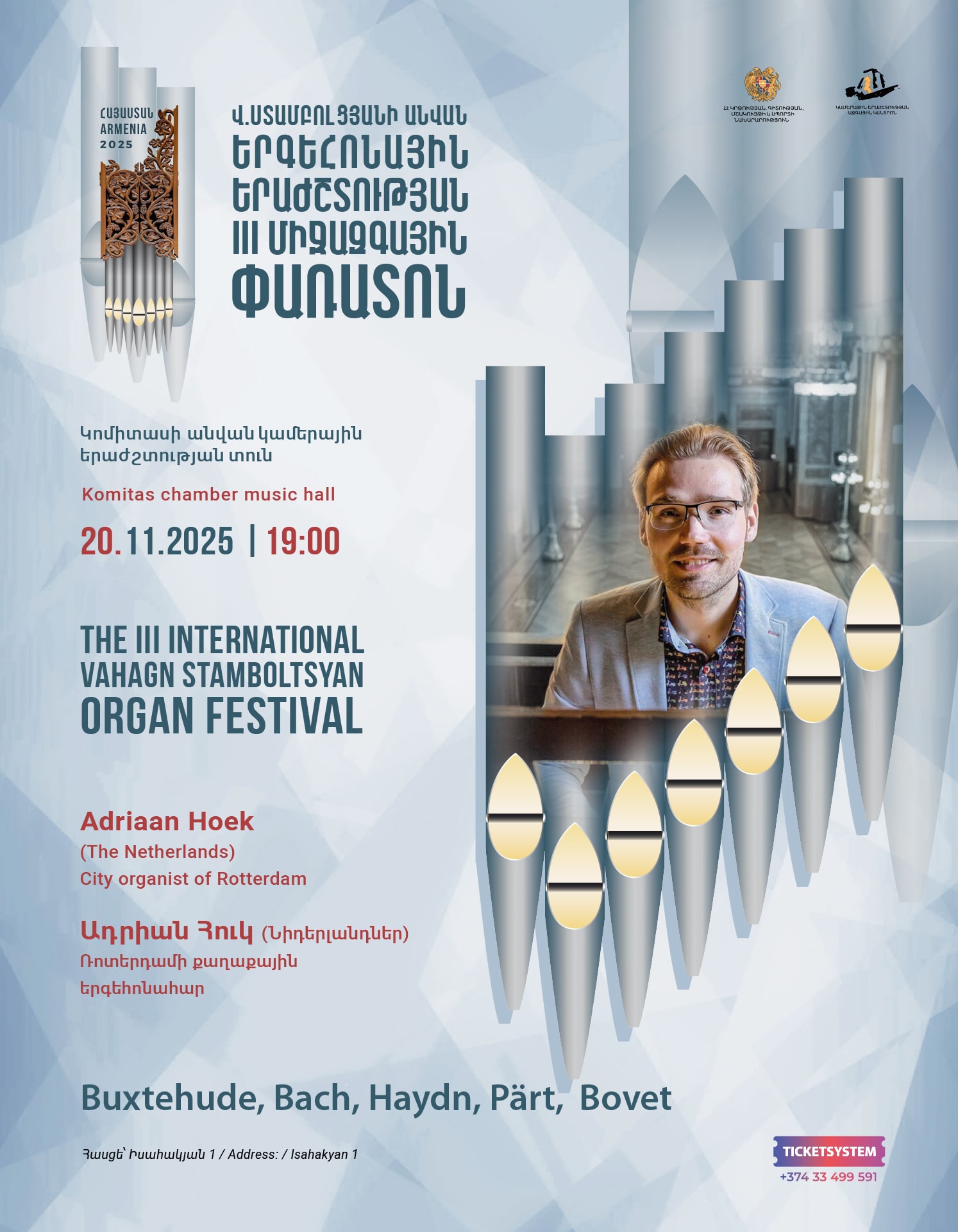 Կոմիտասի անվան կամերային երաժշտության տանը նոյեմբերի 20-ին՝ ժամը 19:00-ին, Վահագն Ստամբոլցյանի անվան երգեհոնային երաժշտության երրորդ միջազգային փառատոնի շրջանակում տեղի կունենա Ռոտերդամի քաղաքային երգեհոնահար Ադրիան Հուկի (Նիդերլանդներ) մենահամերգը: